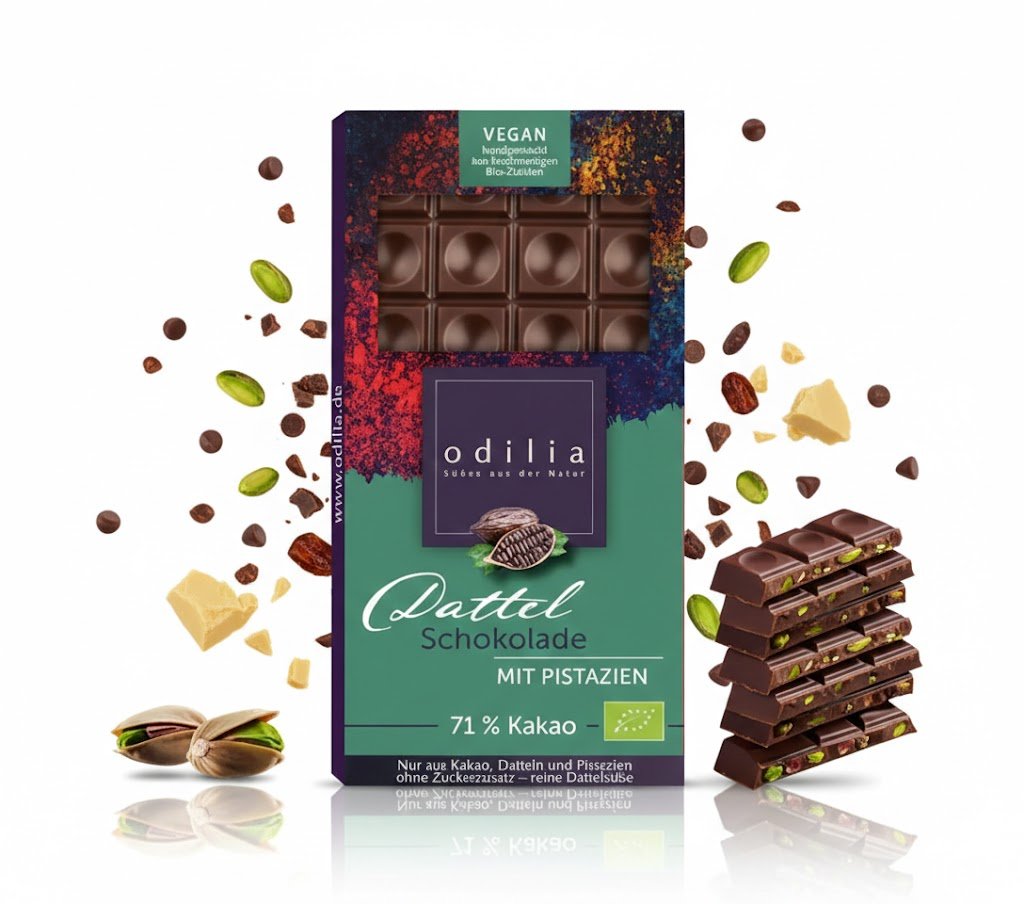 Genießen Sie die köstliche Kombination aus 71% Kakao, süßen Datteln und feinen Pistazien in unserer Bio Dattel Schokolade mit Pistazie. Diese vegane, glutenfreie und nachhaltig verpackte Dattelschokolade vereint natürliche Süße und intensiven Geschmack für einen besonderen Genussmoment.